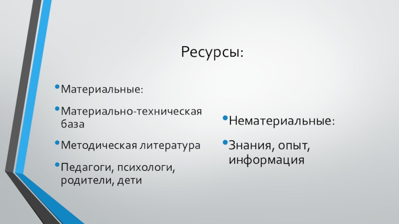 Ресурсы:Материальные: Материально-техническая базаМетодическая литератураПедагоги, психологи, родители, детиНематериальные:Знания, опыт, информация