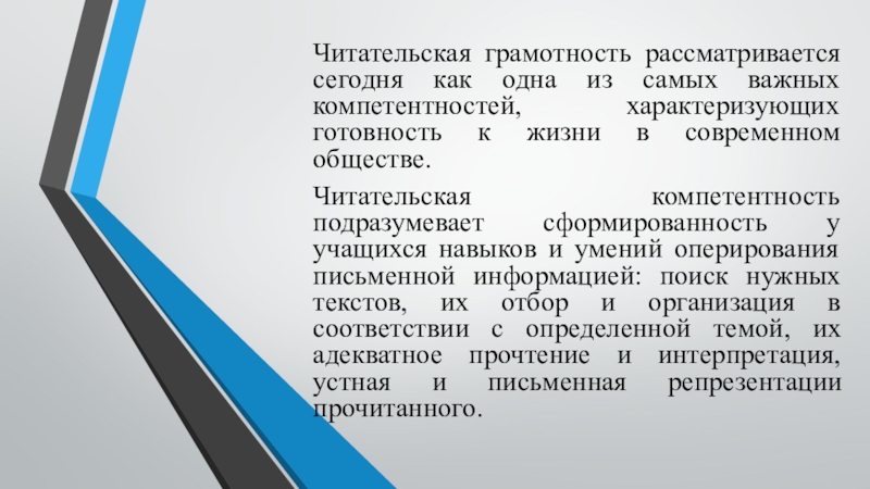 Читательская компетентность подразумевает сформированность у учащихся навыков и умений оперирования письменной информацией: поиск нужных текстов, их отбор и организация в соответствии с определенной темой, их адекватное прочтение и интерпретация, устная и письменная репрезентации прочитанного.