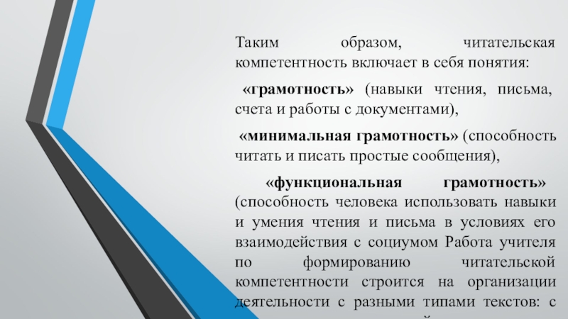 Таким образом, читательская компетентность включает в себя понятия:	 «грамотность» (навыки чтения, письма, счета и работы с документами),