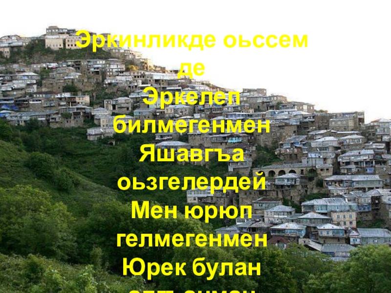 Эркинликде оьссем деЭркелеп билмегенменЯшавгъа оьзгелердейМен юрюп гелмегенменЮрек булан алгъанманАлгъан-алгъан абатым.Йыр болуп юрегимденЧыкъгъан эки къанатым.