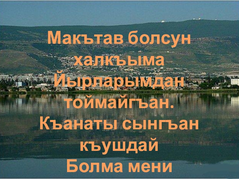 Макътав болсун халкъымаЙырларымдан тоймайгъан.Къанаты сынгъан къушдайБолма мени къоймайгъан.
