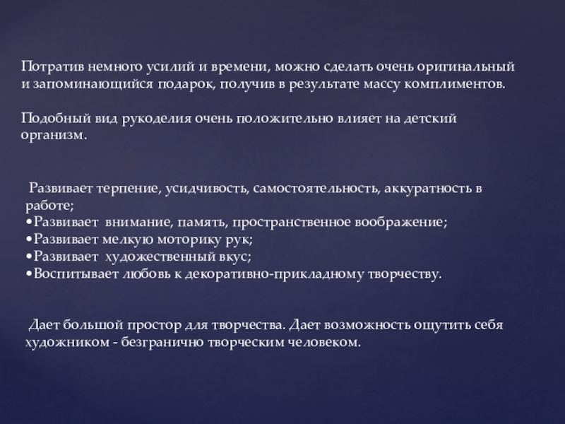 Развивает терпение, усидчивость, самостоятельность, аккуратность в работе;