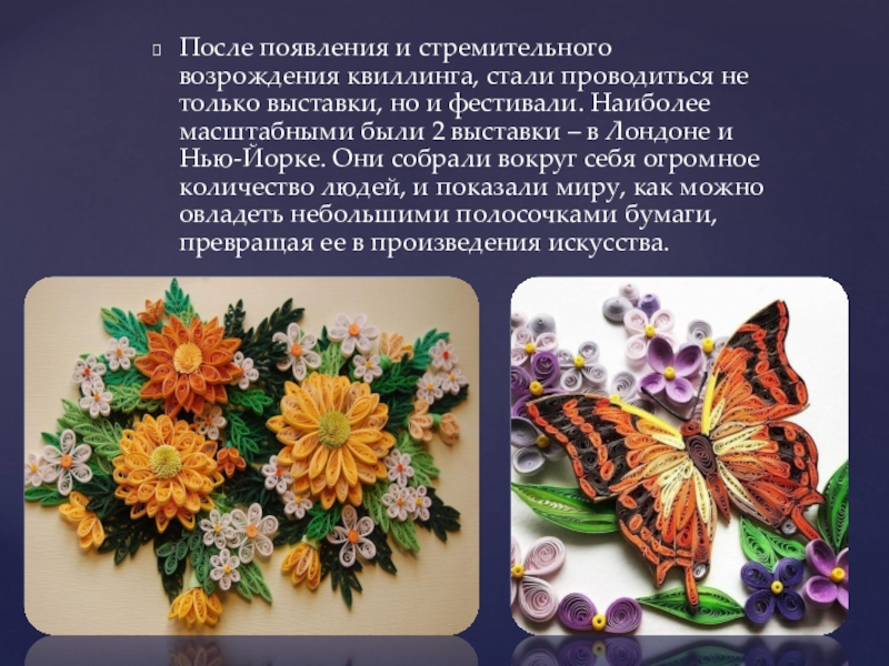 но и фестивали. Наиболее масштабными были 2 выставки – в Лондоне и Нью-Йорке. Они собрали вокруг себя огромное количество людей, и показали миру, как можно овладеть небольшими полосочками бумаги, превращая ее в произведения искусства.