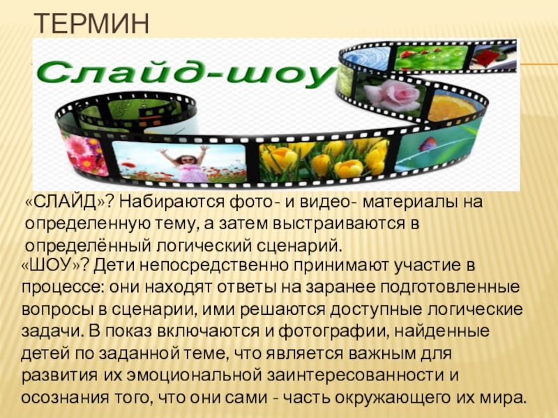«ШОУ»? Дети непосредственно принимают участие в процессе: они находят ответы на заранее подготовленные вопросы в сценарии, ими решаются доступные логические задачи. В показ включаются и фотографии, найденные детей по заданной теме, что является важным для развития их эмоциональной заинтересованности и осознания того, что они сами - часть окружающего их мира.