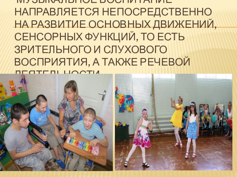 Слайд 32 Музыкальное воспитание направляется непосредственно на развитие основных движений, сенсорных функций, то