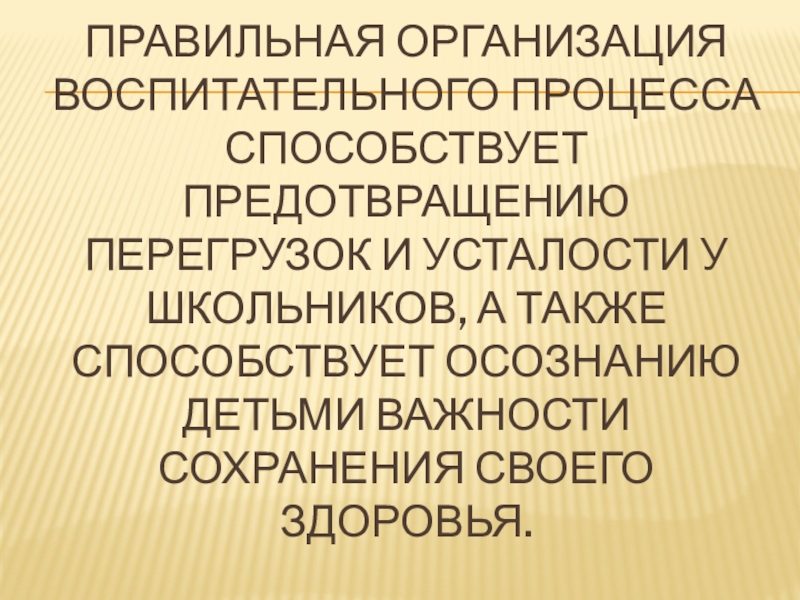 Слайд 38правильная организация воспитательного процесса способствует предотвращению перегрузок и усталости у школьников,