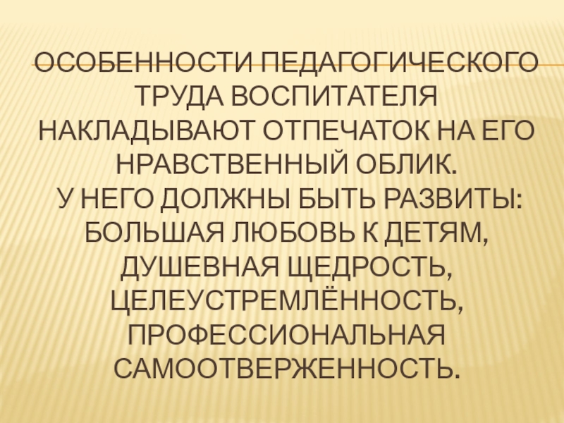 Слайд 45Особенности педагогического труда воспитателя накладывают отпечаток на его нравственный облик.
