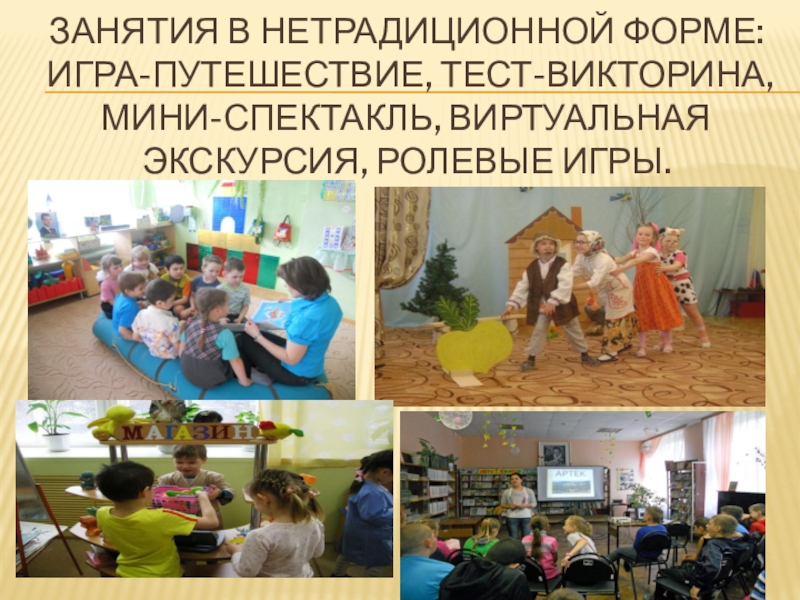 игра-путешествие, тест-викторина, мини-спектакль, виртуальная экскурсия, ролевые игры.