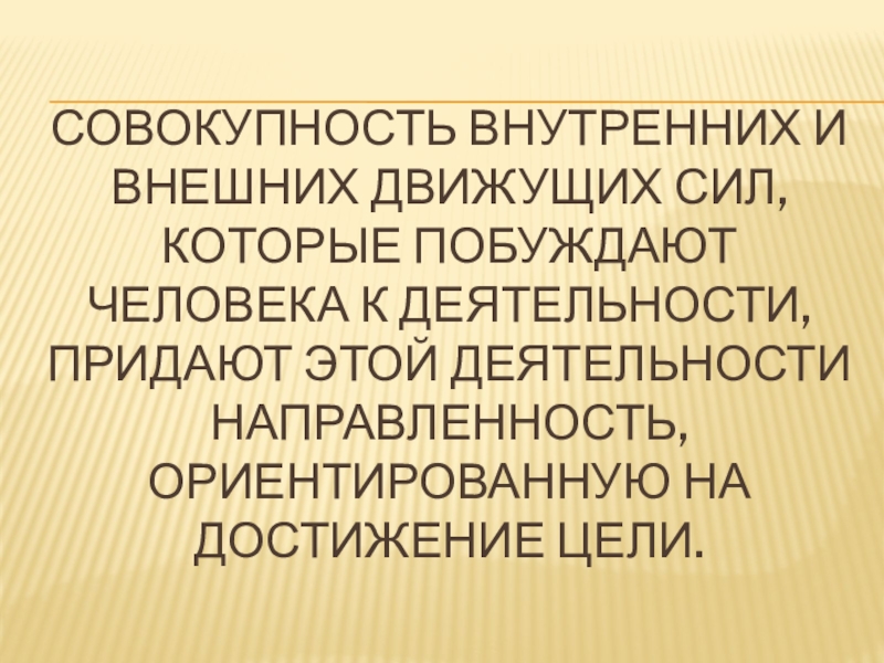 Слайд 39совокупность внутренних и внешних движущих сил, которые побуждают человека к деятельности,