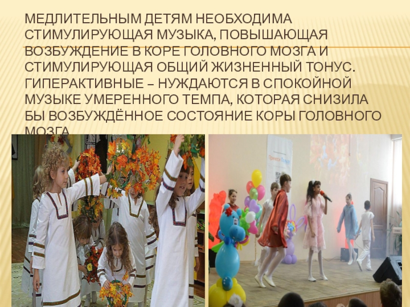 Слайд 33медлительным детям необходима стимулирующая музыка, повышающая возбуждение в коре головного мозга