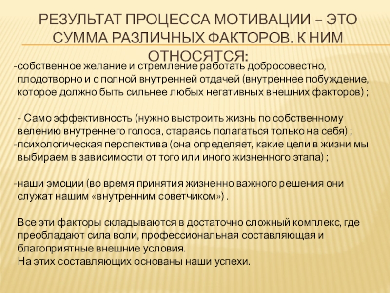 Слайд 44Результат процесса мотивации – это сумма различных факторов. К ним относятся: