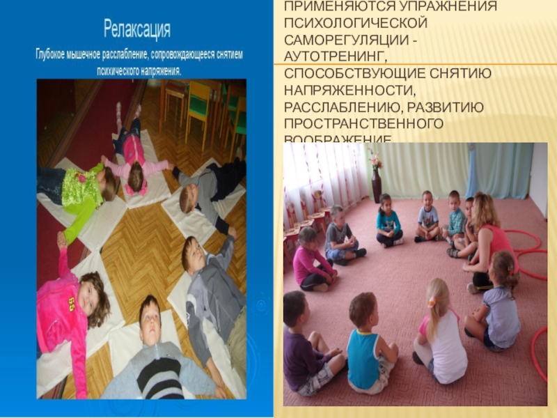 Слайд 36применяются упражнения психологической саморегуляции - аутотренинг, способствующие снятию напряженности, расслаблению, развитию