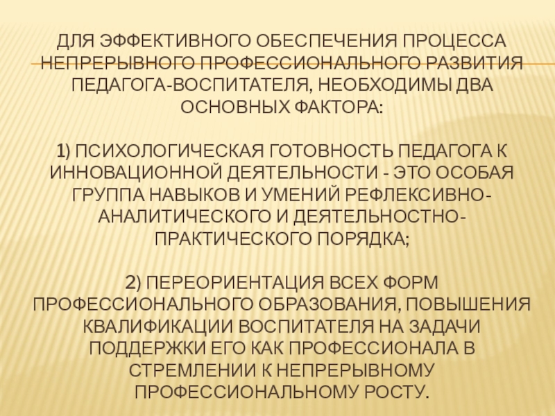 Слайд 24для эффективного обеспечения процесса непрерывного профессионального развития педагога-воспитателя, необходимы два основных