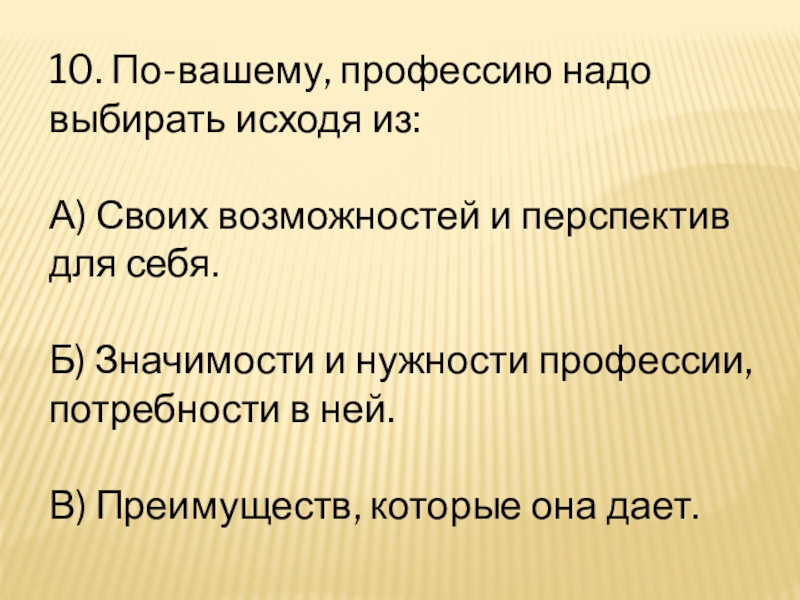 Слайд 1310. По-вашему, профессию надо выбирать исходя из: