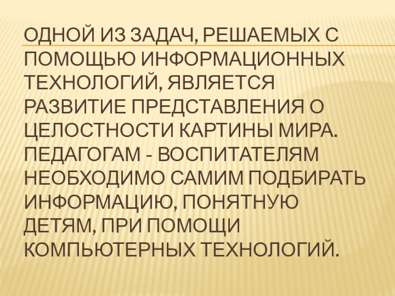 о целостности картины мира. Педагогам - воспитателям необходимо самим подбирать информацию, понятную детям, при помощи компьютерных технологий.