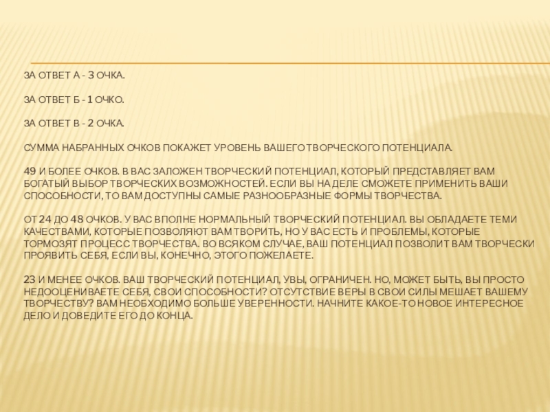 Сумма набранных очков покажет уровень вашего творческого потенциала.