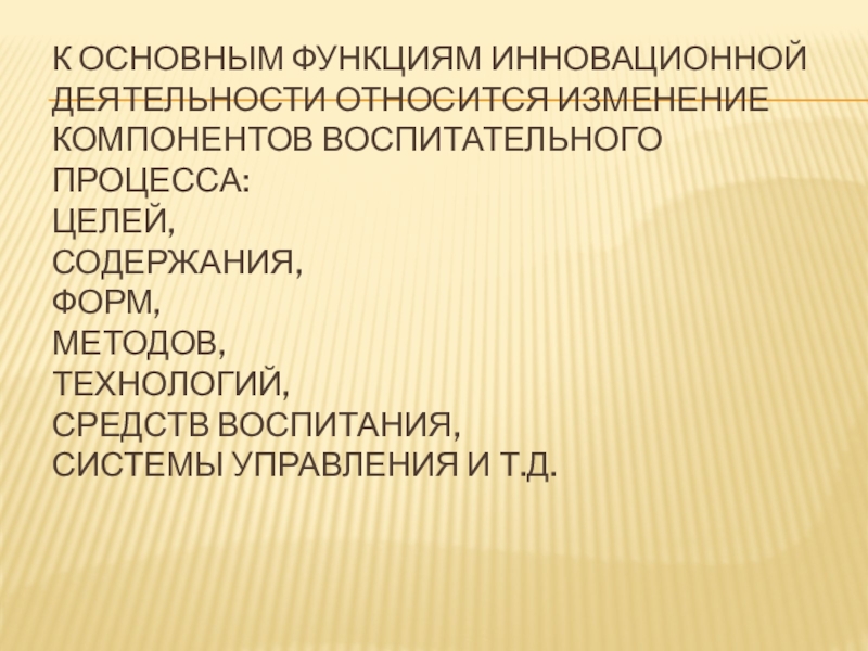 Слайд 22К основным функциям инновационной деятельности относится изменение компонентов воспитательного процесса: