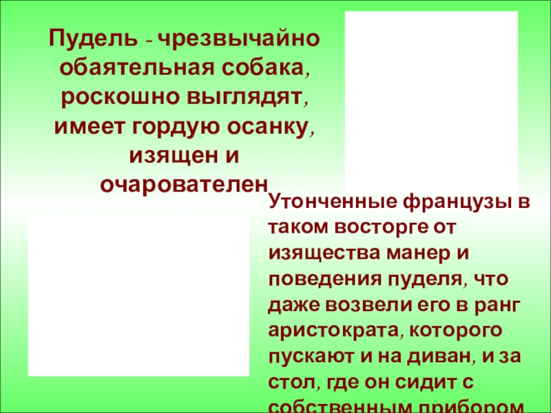 Утонченные французы в таком восторге от изящества манер и поведения пуделя, что даже возвели его в ранг аристократа, которого пускают и на диван, и за стол, где он сидит с собственным прибором и салфеткой.