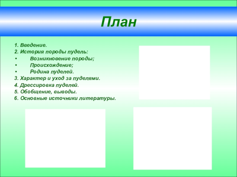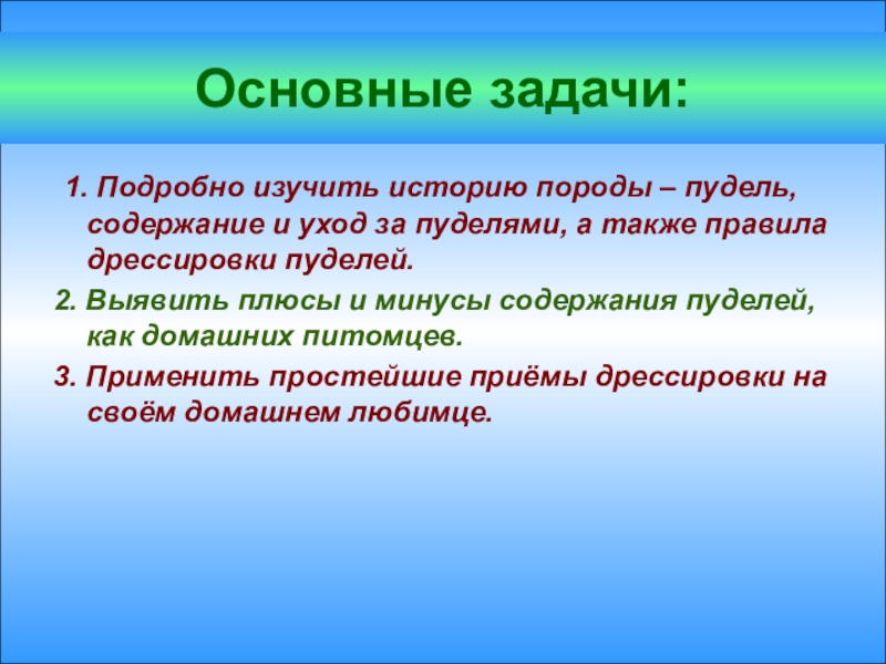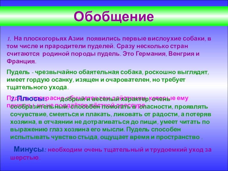 2. Плюсы: добрый и веселый характер, очень сообразительный, способен помогать в опасности, проявлять сочувствие, смеяться и плакать, ликовать от радости, а потеряв хозяина, в отчаянии не дотрагиваться до пищи, умеет читать по выражению глаз хозяина его мысли. Пудель способен испытывать чувство стыда, ощущает время и пространство .