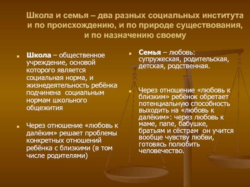 Через отношение «любовь к близким» ребёнок обретает потенциальную способность выходить на «любовь к далёким»: через любовь к маме, папе, бабушке, братьям и сёстрам он учится вообще чувству любви, готовясь полюбить человечество.