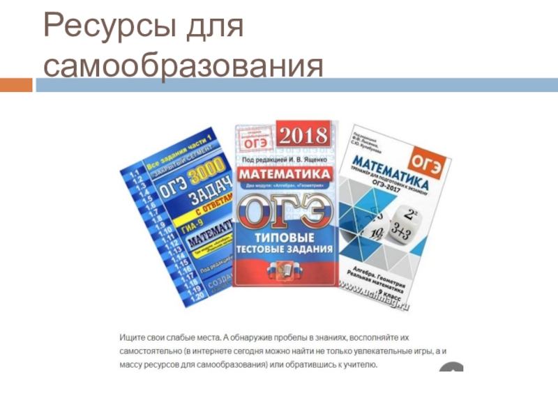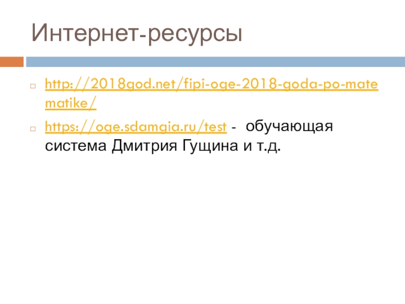 Интернет-ресурсыhttp://2018god.net/fipi-oge-2018-goda-po-matematike/https://oge.sdamgia.ru/test - обучающая система Дмитрия Гущина и т.д.