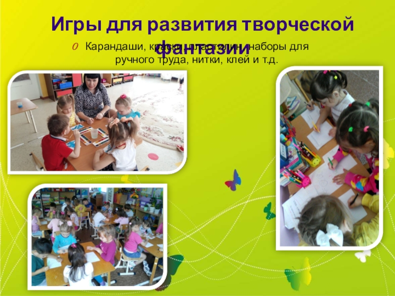 Игры для развития творческой фантазииКарандаши, краски, пластилин, наборы для ручного труда, нитки, клей и т.д.