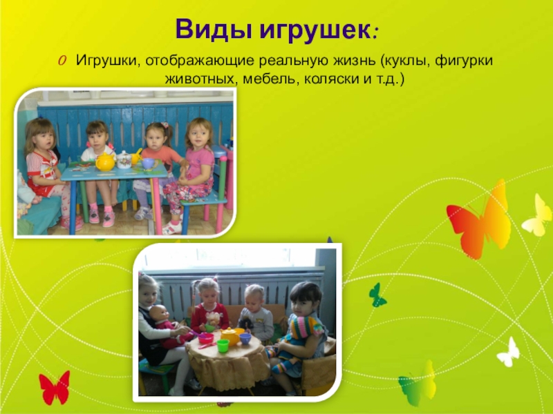 Виды игрушек:Игрушки, отображающие реальную жизнь (куклы, фигурки животных, мебель, коляски и т.д.)