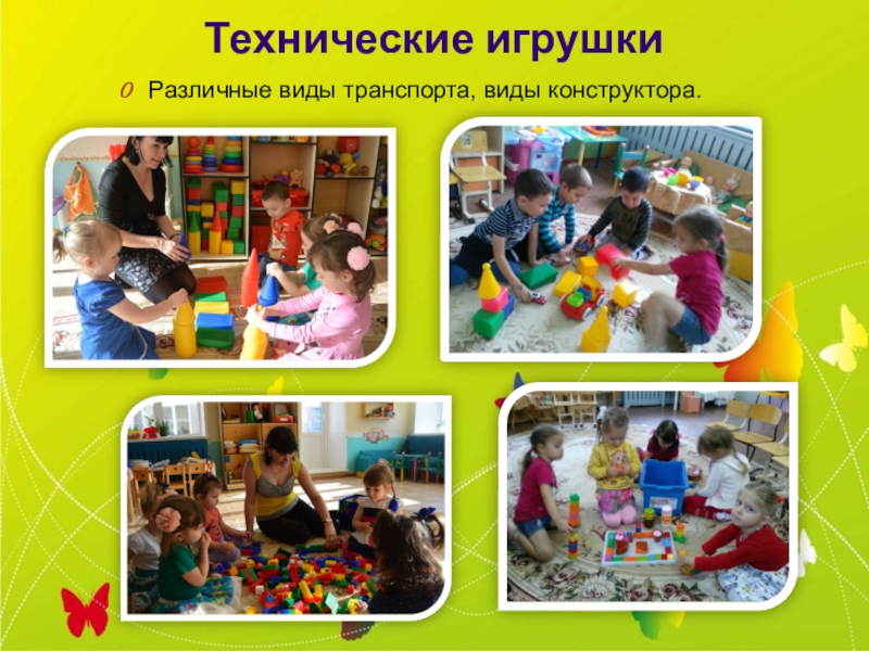 Технические игрушкиРазличные виды транспорта, виды конструктора.