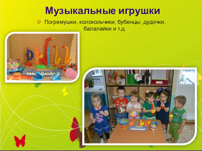 Музыкальные игрушкиПогремушки, колокольчики, бубенцы, дудочки, балалайки и т.д.