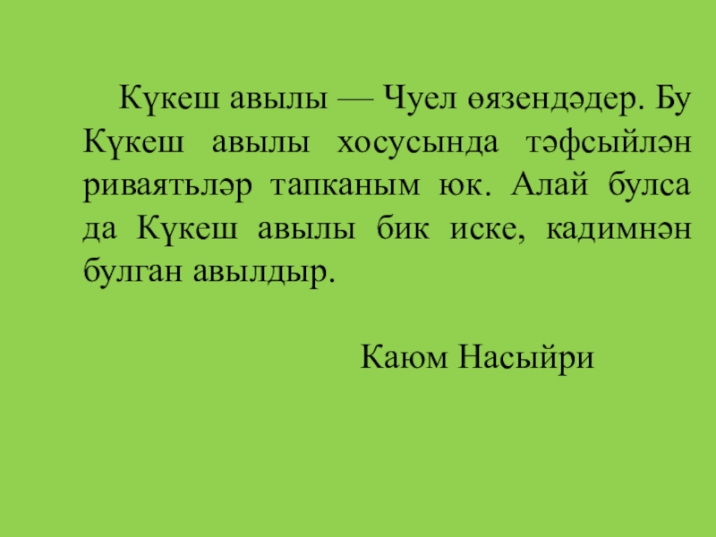 Слайд 2Күкеш авылы — Чуел өязендәдер. Бу Күкеш авылы хосусында тәфсыйлән риваятьләр