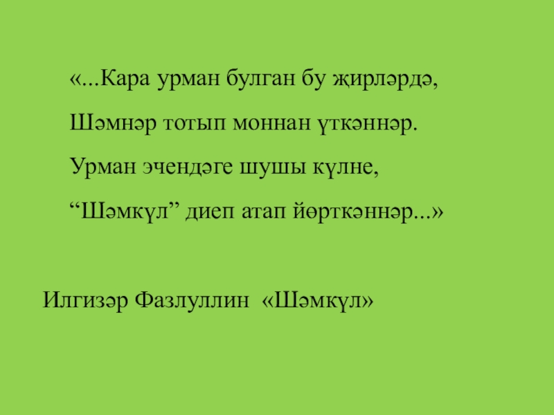 «...Кара урман булган бу җирләрдә, Шәмнәр тотып моннан үткәннәр. Урман эчендәге шушы күлне,“Шәмкүл” диеп атап йөрткәннәр...»Илгизәр Фазлуллин