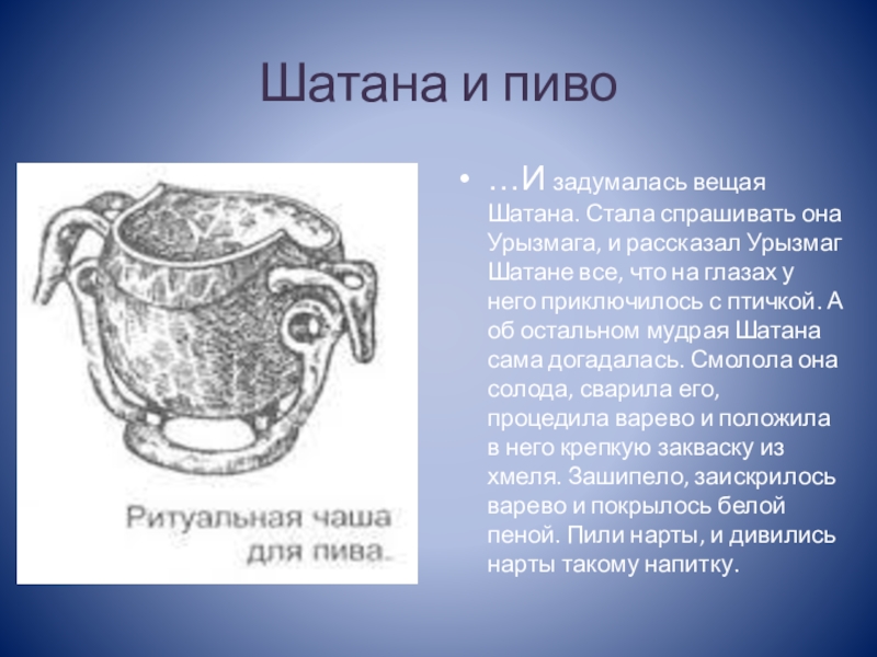 рассказал Урызмаг Шатане все, что на глазах у него приключилось с птичкой. А об остальном мудрая Шатана сама догадалась. Смолола она солода, сварила его, процедила варево и положила в него крепкую закваску из хмеля. Зашипело, заискрилось варево и покрылось белой пеной. Пили нарты, и дивились нарты такому напитку.