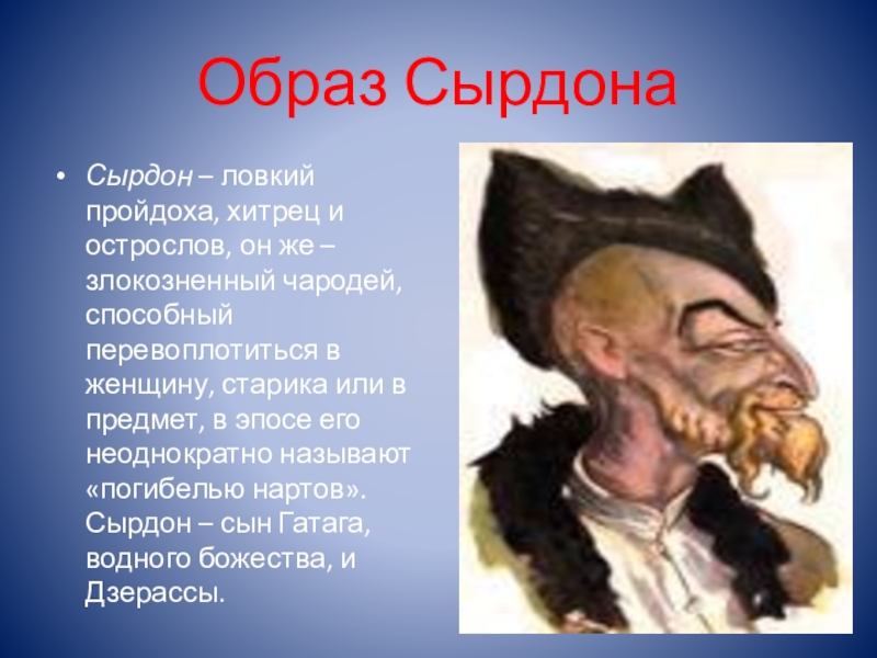 чародей, способный перевоплотиться в женщину, старика или в предмет, в эпосе его неоднократно называют «погибелью нартов». Сырдон – сын Гатага, водного божества, и Дзерассы.