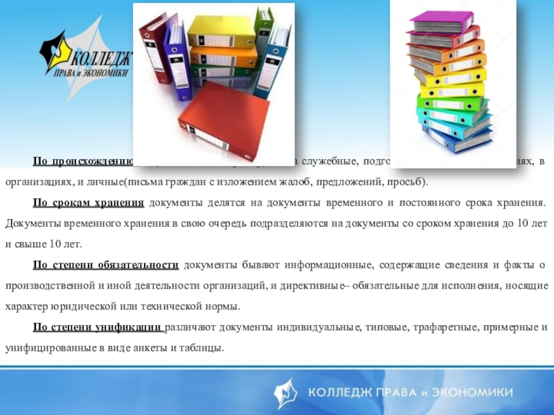 Слайд 11По происхождению документы классифицируют на служебные, подготовленные на предприятиях, в организациях,