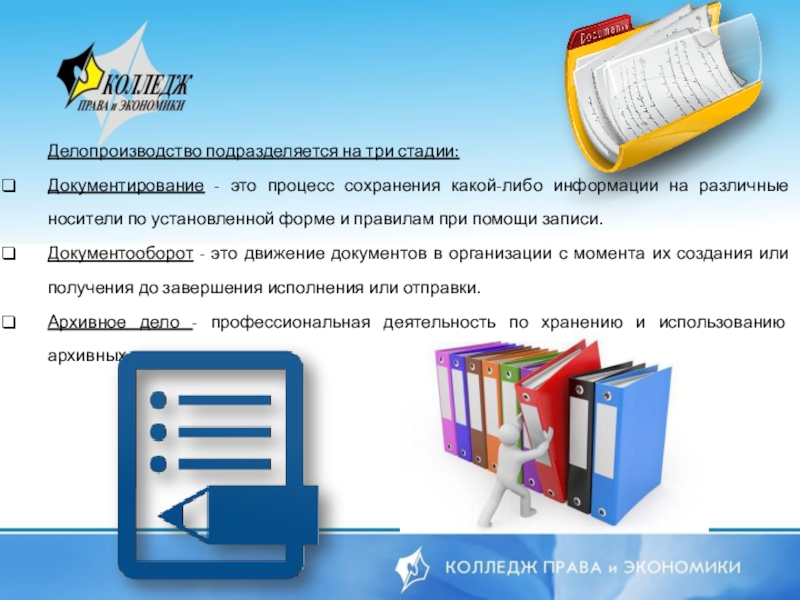 Слайд 5Делопроизводство подразделяется на три стадии: