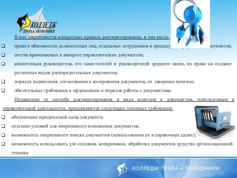Слайд 13В них закрепляются конкретные правила документирования, в том числе:
