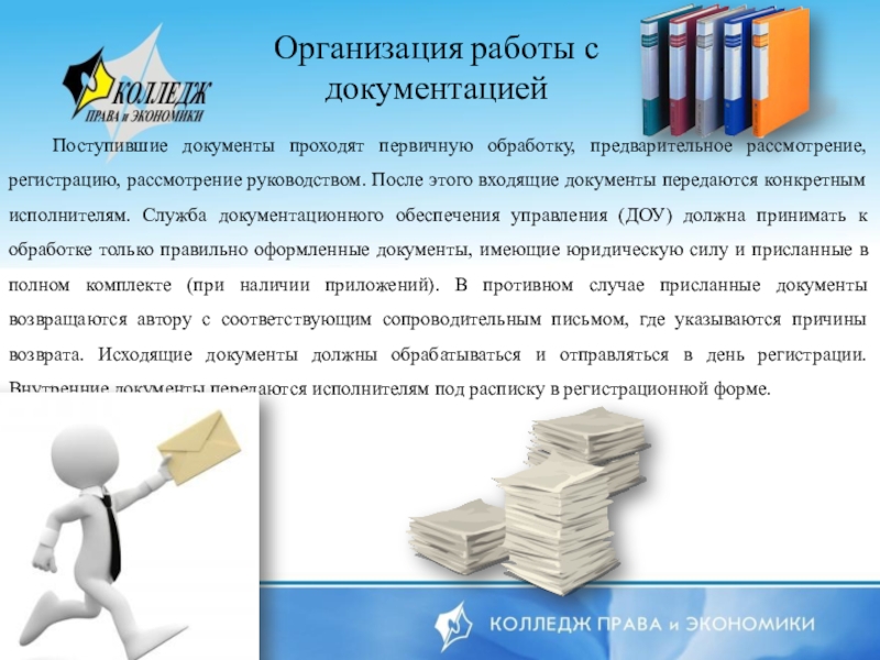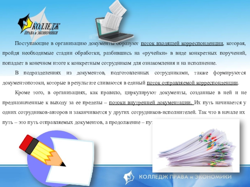 Слайд 16Поступающие в организацию документы образуют поток входящей корреспонденции, которая, пройдя необходимые