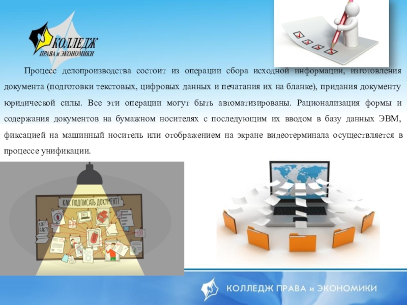 Слайд 15Процесс делопроизводства состоит из операции сбора исходной информации, изготовления документа (подготовки