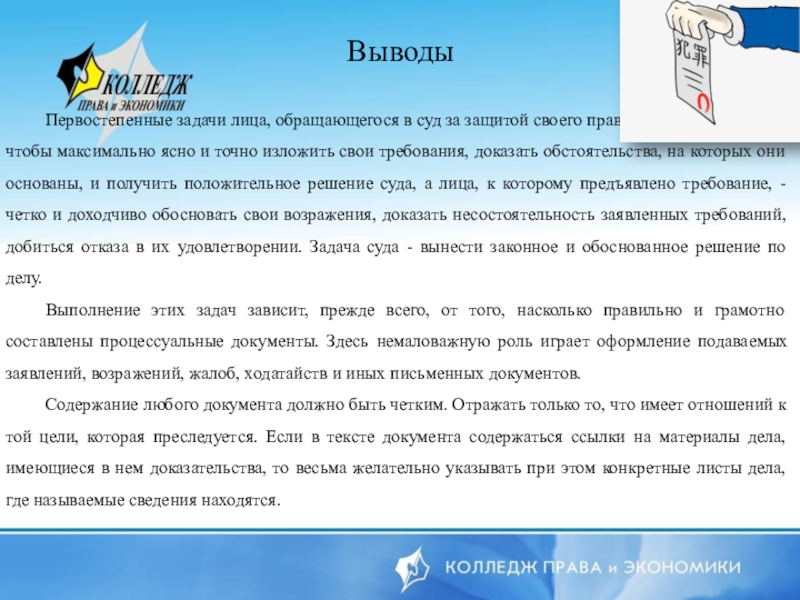 Выполнение этих задач зависит, прежде всего, от того, насколько правильно и грамотно составлены процессуальные документы. Здесь немаловажную роль играет оформление подаваемых заявлений, возражений, жалоб, ходатайств и иных письменных документов.