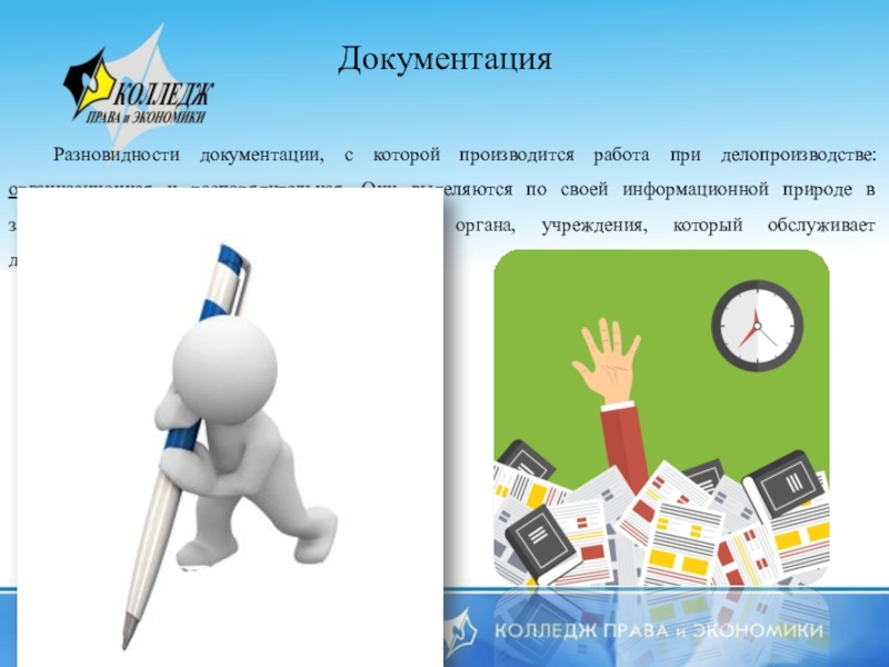 Разновидности документации, с которой производится работа при делопроизводстве: организационная и распорядительная.
