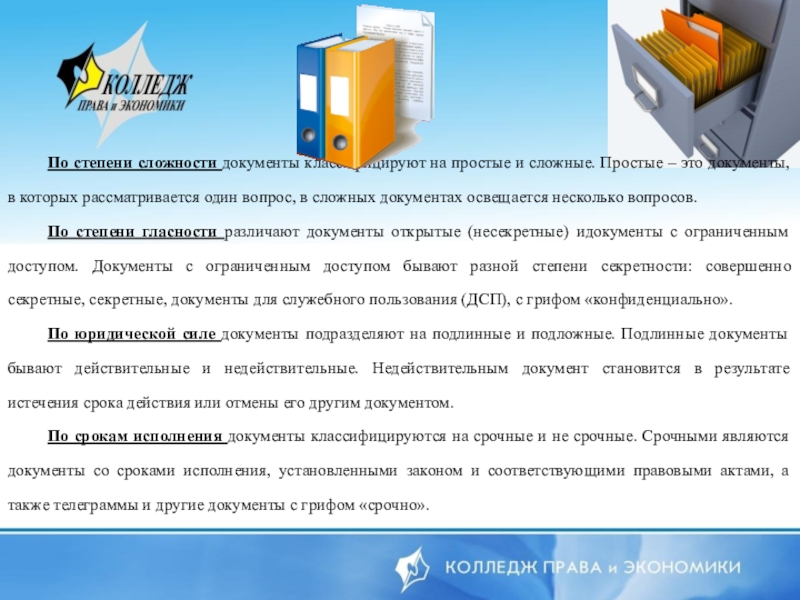 Слайд 10По степени сложности документы классифицируют на простые и сложные. Простые –