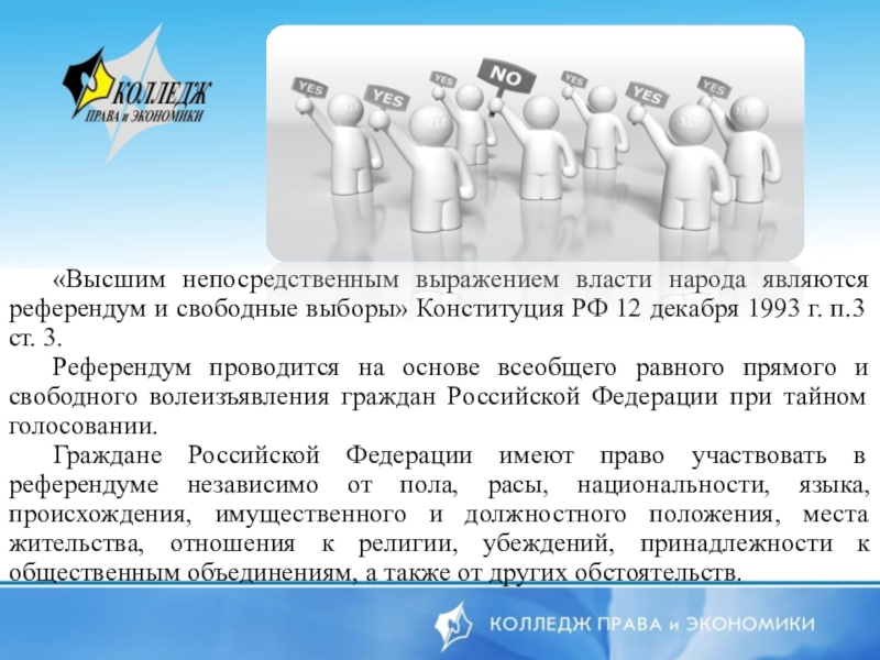 Слайд 6«Высшим непосредственным выражением власти народа являются референдум и свободные выборы» Конституция