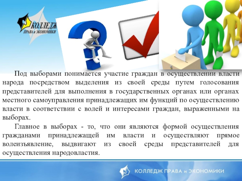 Слайд 7Под выборами понимается участие граждан в осуществлении власти народа посредством выделения