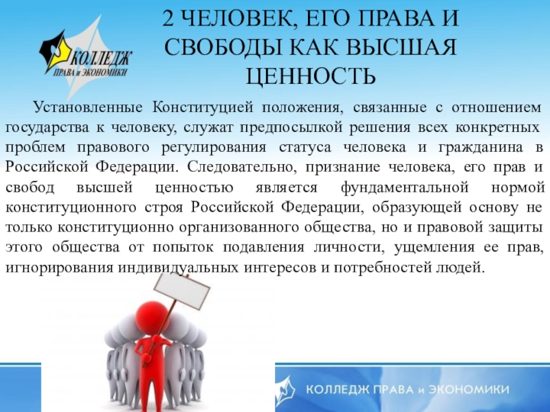 Слайд 112 ЧЕЛОВЕК, ЕГО ПРАВА И СВОБОДЫ КАК ВЫСШАЯ ЦЕННОСТЬ