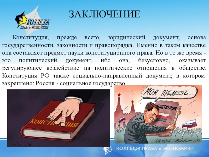Конституция, прежде всего, юридический документ, основа государственности, законности и правопорядка. Именно