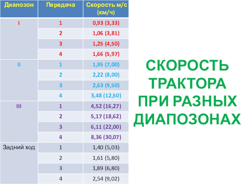 Слайд 20СКОРОСТЬ ТРАКТОРА ПРИ РАЗНЫХ ДИАПОЗОНАХ