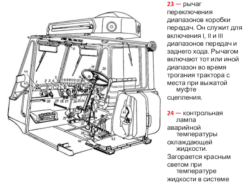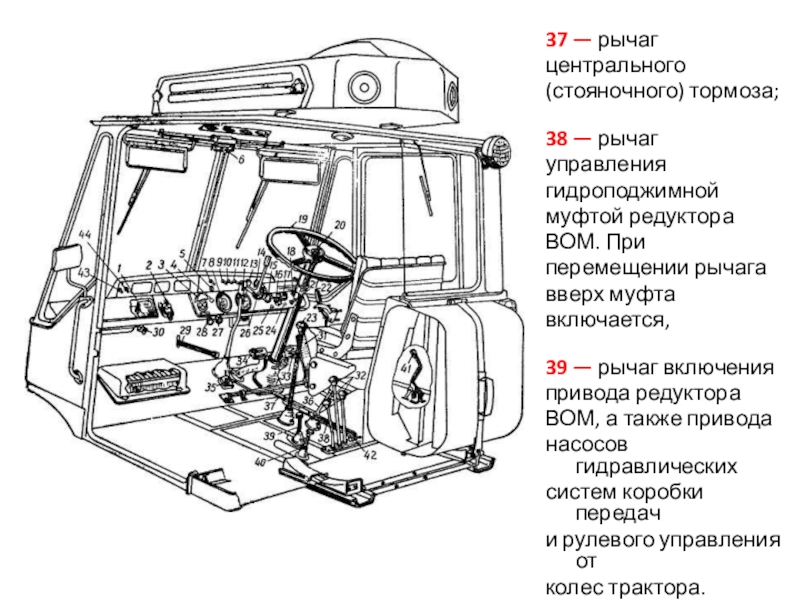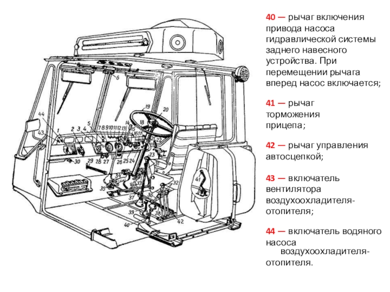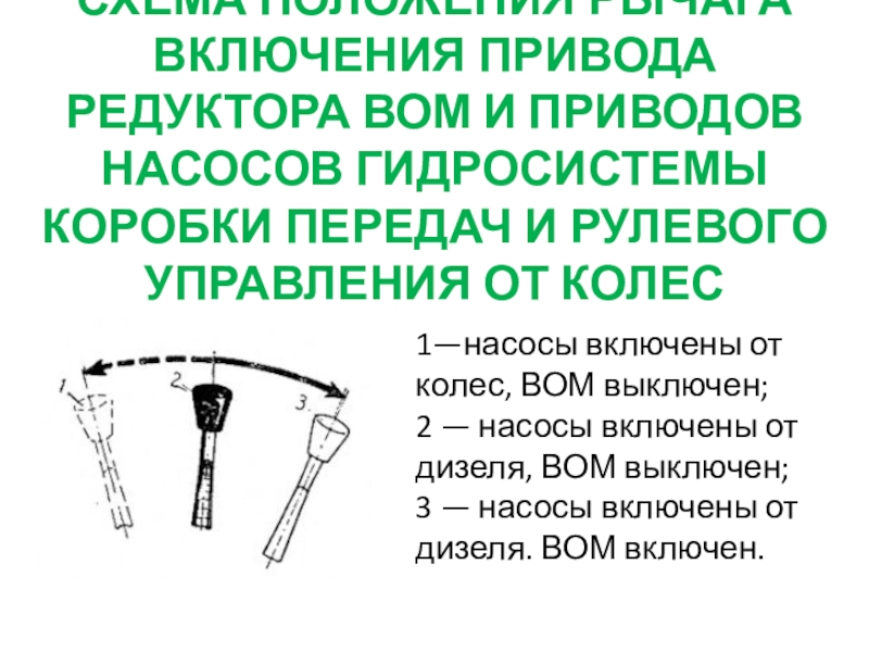 Слайд 22СХЕМА ПОЛОЖЕНИЯ РЫЧАГА ВКЛЮЧЕНИЯ ПРИВОДА РЕДУКТОРА ВОМ И ПРИВОДОВ НАСОСОВ ГИДРОСИСТЕМЫ