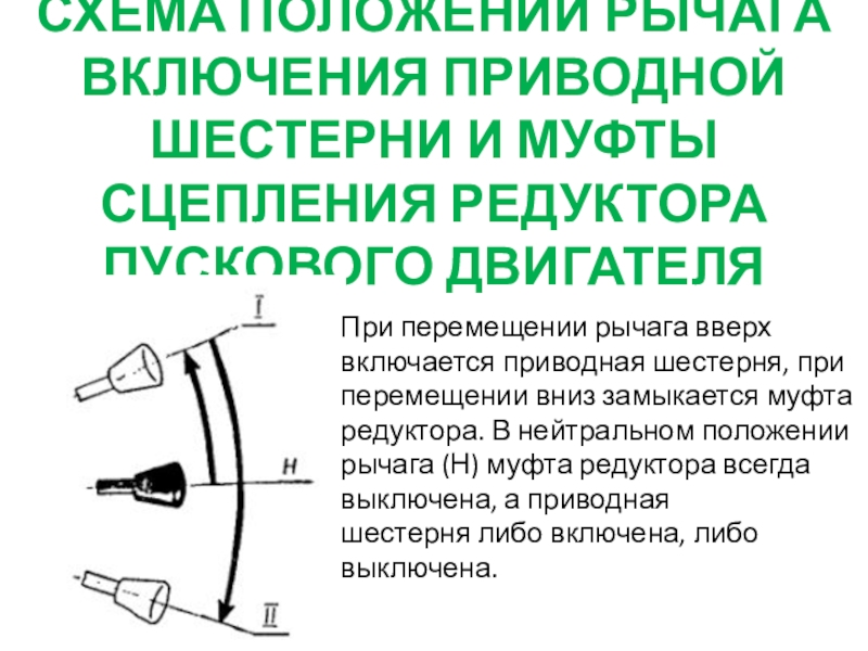 Слайд 21СХЕМА ПОЛОЖЕНИЙ РЫЧАГА ВКЛЮЧЕНИЯ ПРИВОДНОЙ ШЕСТЕРНИ И МУФТЫ СЦЕПЛЕНИЯ РЕДУКТОРА ПУСКОВОГО