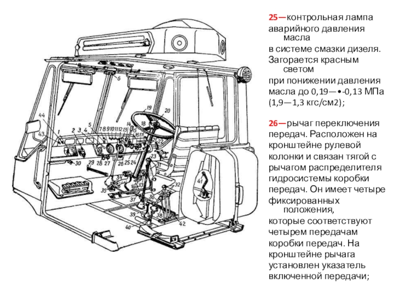тягой с рычагом распределителя гидросистемы коробки передач. Он имеет четыре фиксированных положения, которые соответствуют четырем передачам коробки передач. На кронштейне рычага установлен указатель включенной передачи;