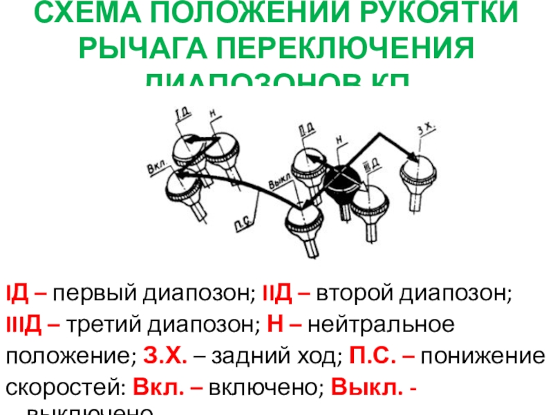 Слайд 18СХЕМА ПОЛОЖЕНИЙ РУКОЯТКИ РЫЧАГА ПЕРЕКЛЮЧЕНИЯ ДИАПОЗОНОВ КП